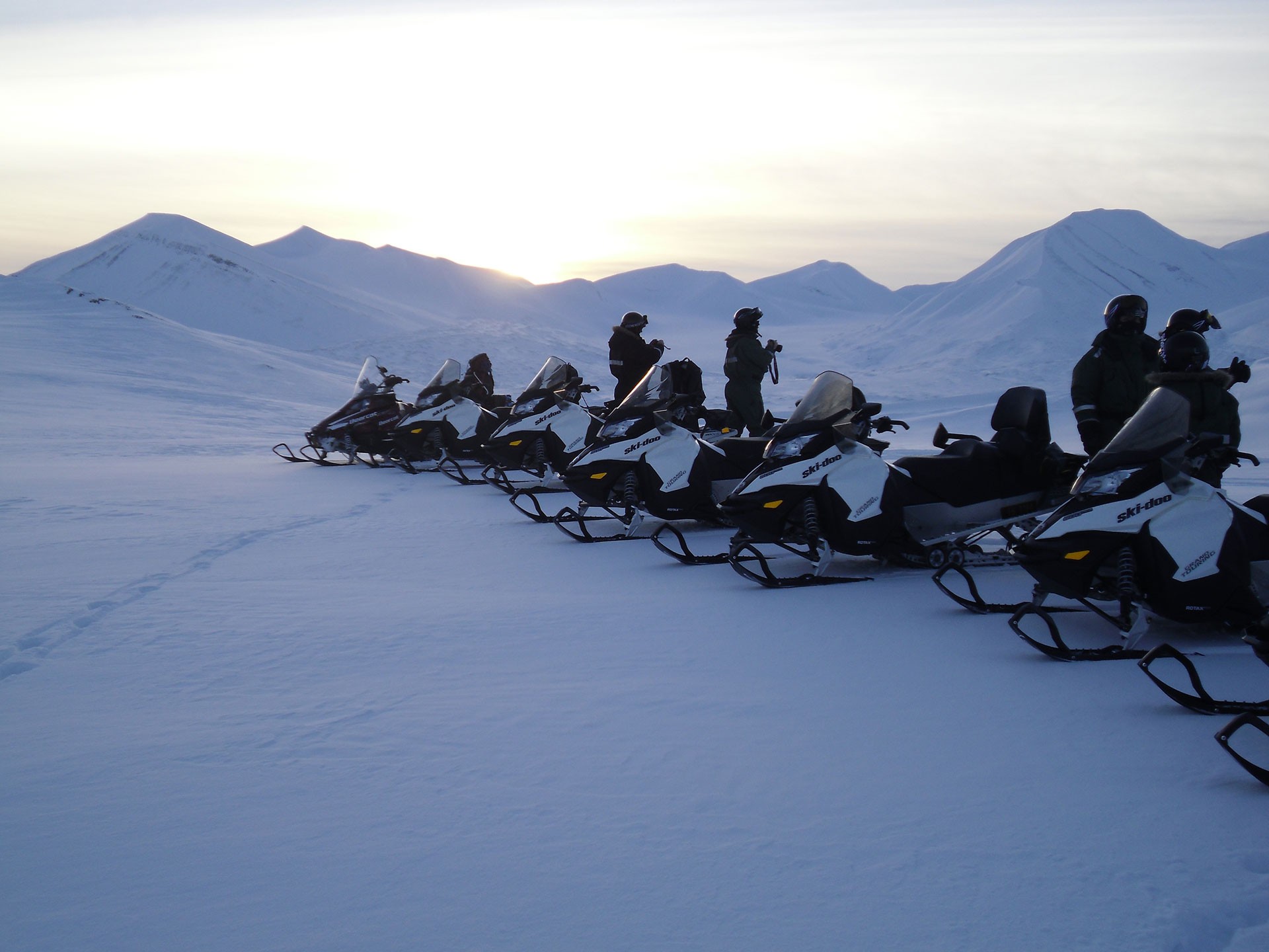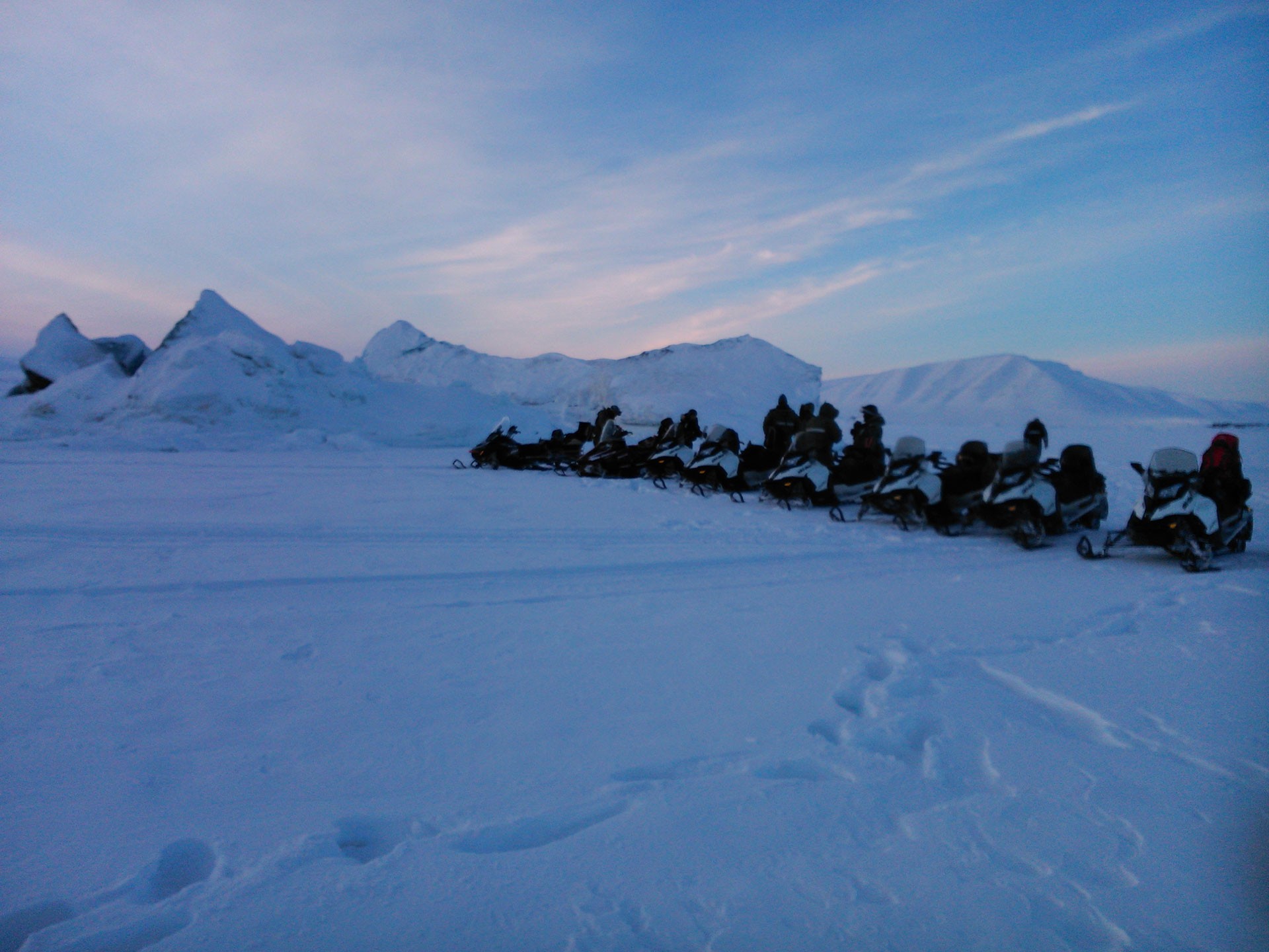 Il giorno successivo la domanda è: East Coast sì, East Coast no? Su questa località i pareri contrastanti si rincorrono. È splendida. C’è solo ghiaccio. Potrai veramente vivere il Polo. Fa solo freddo, meglio la città mineraria russa dove c’è il rinomato brot sovietico bello caldo! Tra chi la ritiene una tappa imperdibile e chi la considera puro masochismo, opto per il primo punto di vista e decido di andare. In effetti la costa orientale dell’isola Spitsbergen, molto più fredda perché non è bagnata dalla corrente del Golfo, costringe chi la vuole visitare ad un’escursione in motoslitta di circa dieci ore. Si capisce quindi come un’escursione da queste parti abbia tutti i numeri per diventare un incubo per l’improvvido turista. L’organizzazione è quella delle grandi occasioni: due guide armate di pistole lanciarazzi, revolver e fucili, ognuna con una motoslitta molto più potente delle nostre capace di far fronte a qualsiasi emergenza. Ognuno dei partecipanti guida la propria motoslitta vestito con una tuta speciale che lo fa assomigliare a un astronauta. Dopo una breve spiegazione su come si manovra la snowmobile (è necessaria la patente perché qui è considerato un normale mezzo di trasporto), si parte. L’inizio è piuttosto turbolento: occhiali e maschere che si ghiacciano, motori che si spengono... Piano piano riusciamo a partire e a raggiungere la velocità di marcia di circa cinquanta chilometri orari. Superate alcune montagne, inizia un altopiano vastissimo da cui raggiungiamo l’ice shelf, un enorme ghiacciaio coperto di neve fresca. Saliti in cima, iniziamo la velocissima discesa verso la costa e dopo quasi cento chilometri raggiungiamo la banchisa polare, il piatto mare ghiacciato, di tanto in tanto interrotta da iceberg di un blu intenso. È vero, è solo ghiaccio. È vero, fa tanto freddo. È vero, alla fine non vedremo alcun orso polare. È vero, se la sono fatta pagare cara, ma per chi come me è cresciuto a suon di libri d’avventura, l’emozione è enorme e la sensazione di star vivendo un momento unico crea un bello spirito di gruppo. Così dimentichiamo i piccoli inconvenienti e ringraziamo le guide che ci hanno accompagnato a scoprire questi luoghi fino a pochi anni fa riservati solo ai veri esploratori. Arrivati sopra la banchisa, pranziamo in prossimità di un iceberg praticamente in mezzo al mare e sulla via del ritorno facciamo una splendida sosta ristoratrice sotto una cascata ghiacciata. Ormai è buio e sono i fari delle nostre motoslitte a farci strada, rendendo la conclusione dell’avventura ancora più suggestiva.
