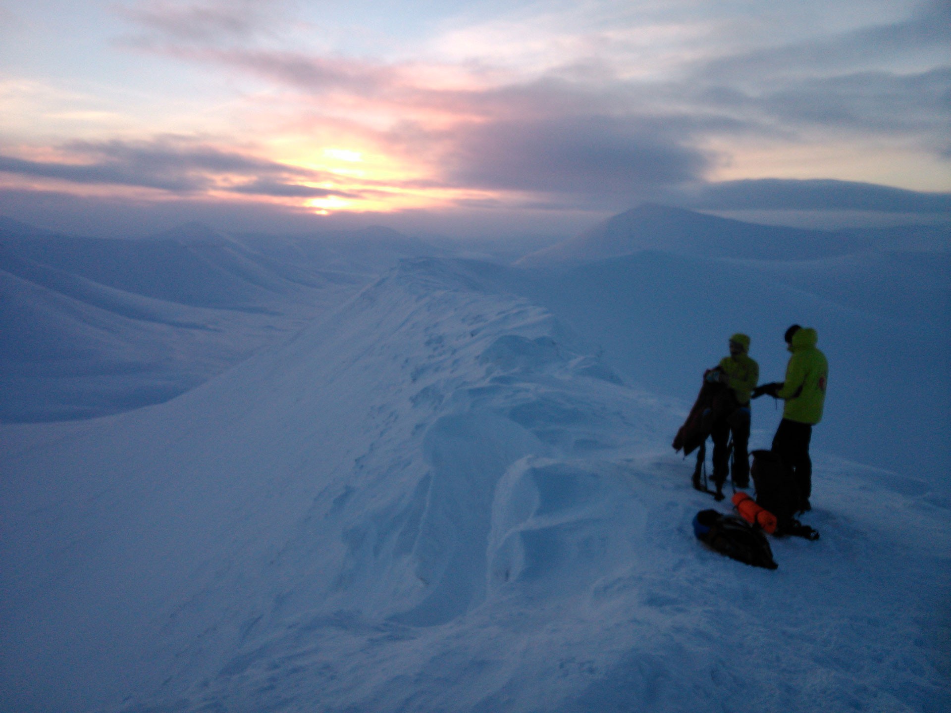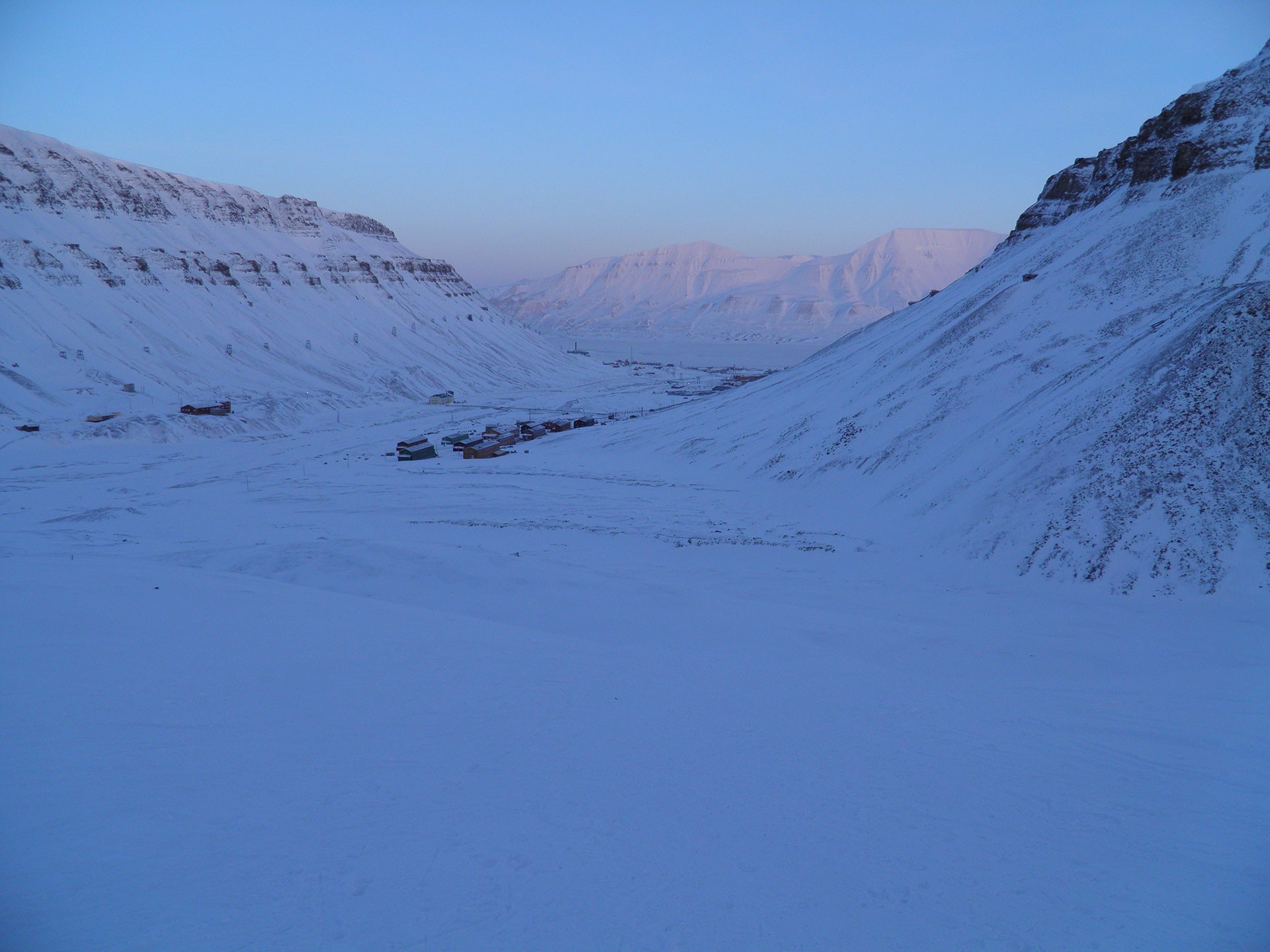 Il primo giorno alle Svalbard comincia con un trekking di sette ore sul Trollstigen, la cima di circa settecento metri poco distante dal villaggio. Parto confortato dalle previsioni meteo che confermano l’utilità degli scarponi, pare che lassù la temperatura potrebbe facilmente raggiungere i -40°C. Mentre le guide caricano il fucile, ci incamminiamo nella stretta valle scavata dal ghiacciaio subito sopra il paese. Dopo una faticosa salita il panorama si apre e siamo in paradiso. Picchi e catene montuose di un bianco immacolato a perdita d’occhio, immersi nella luce rosata di quest’alba senza fine, ripagano di tutta la fatica e si ha la sensazione di essere tra le nuvole, di trovarsi alla fine del mondo. A tendere l’orecchio pare di sentire l’eco delle epiche sfide sostenute dall’Uomo con la Natura estrema e per una manciata di minuti ci sentiamo dei veri esploratori. Dopo il pranzo in cielo con quello che definiscono pomposamente explorer food, semplice cibo disidratato reso commestibile dall’aggiunta di acqua bollente, torniamo in paese.