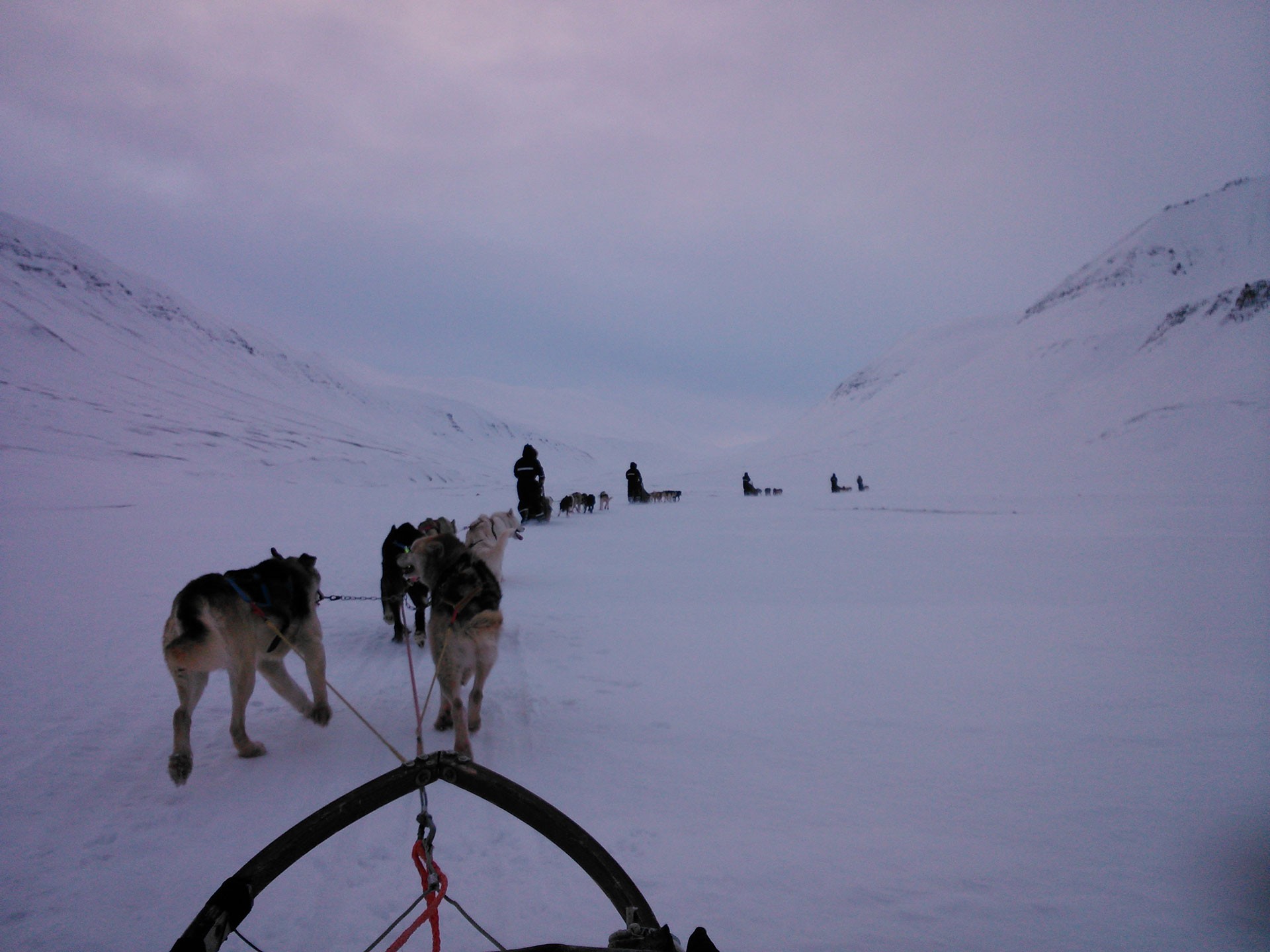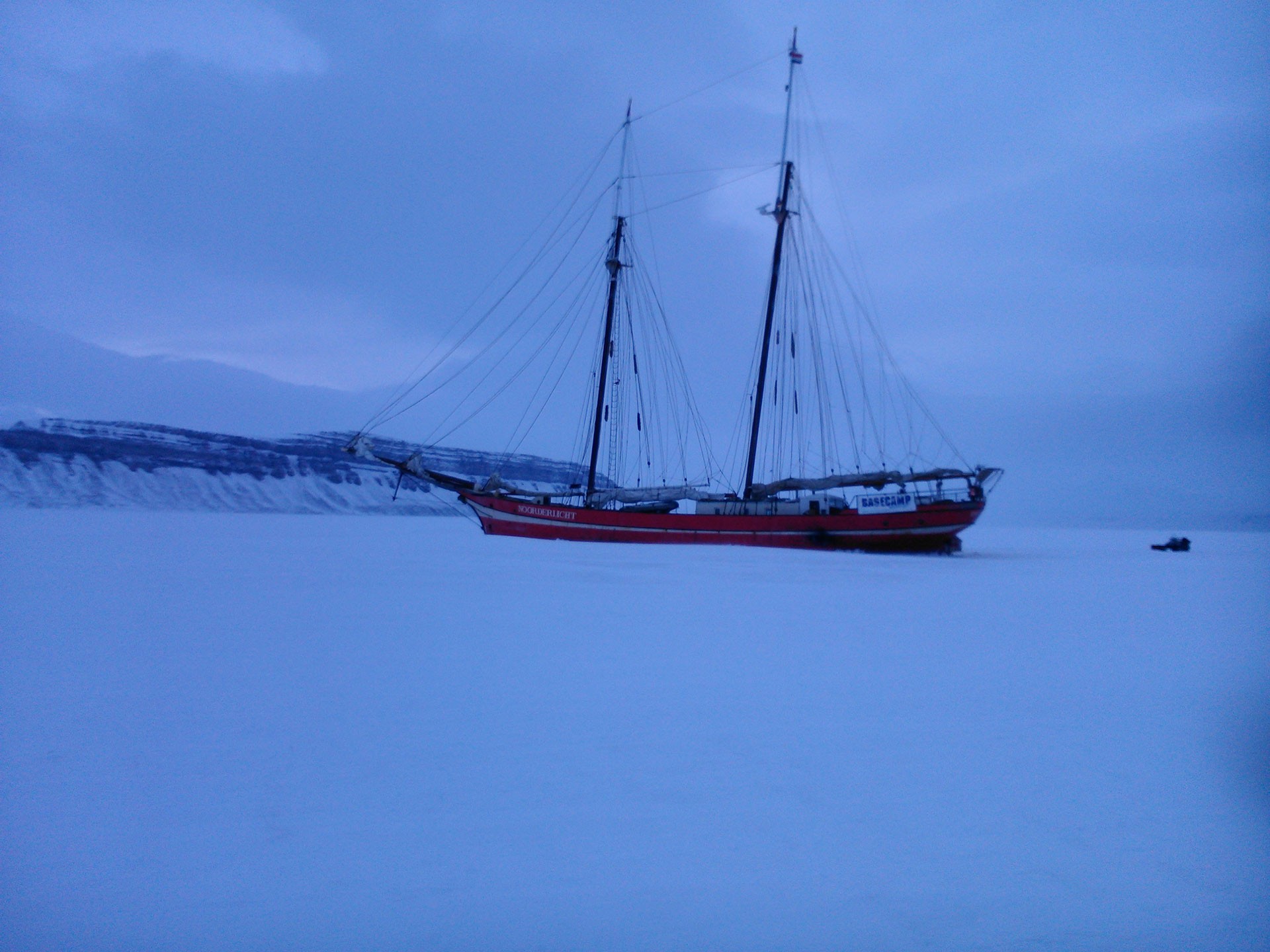 L’ultimo giorno all’arcipelago delle Svalbard si chiude con un’escursione in motoslitta al Templefjorden. La giornata è serena e appena usciti dal villaggio accade la cosa apparentemente più naturale del mondo: il sole compare sopra le montagne. Da queste parti è un vero e proprio evento, accade infatti solo una volta l’anno. Questo è il primo giorno di sole sopra l’orizzonte dopo quattro mesi prima di totale oscurità e poi di crepuscolo, è l’arrivo della bella stagione, è la vita che ricomincia! Dopo una sosta per ammirare l’effetto magico di quella che sembra l’alba di una nuova era, con i raggi di sole che illuminano una pianura spazzata dal fortissimo vento, il viaggio prosegue. Scorgiamo in lontananza una macchia di colore. Scopriamo che alla fine dell’estate in questo fiordo viene lasciato un bel veliero rosso in mezzo al mare, che, ghiacciandosi, lo stringe in una morsa e lo trasforma in una sorta di iceberg artificiale in mezzo alla banchisa. Lo scopo? Sembra assurdo, ma alcune agenzie lo usano come ristorante per le loro escursioni. È di nuovo notte, spinti dal vento alle spalle e con visibilità prossima allo zero, torniamo in città. Il viaggio è finito.