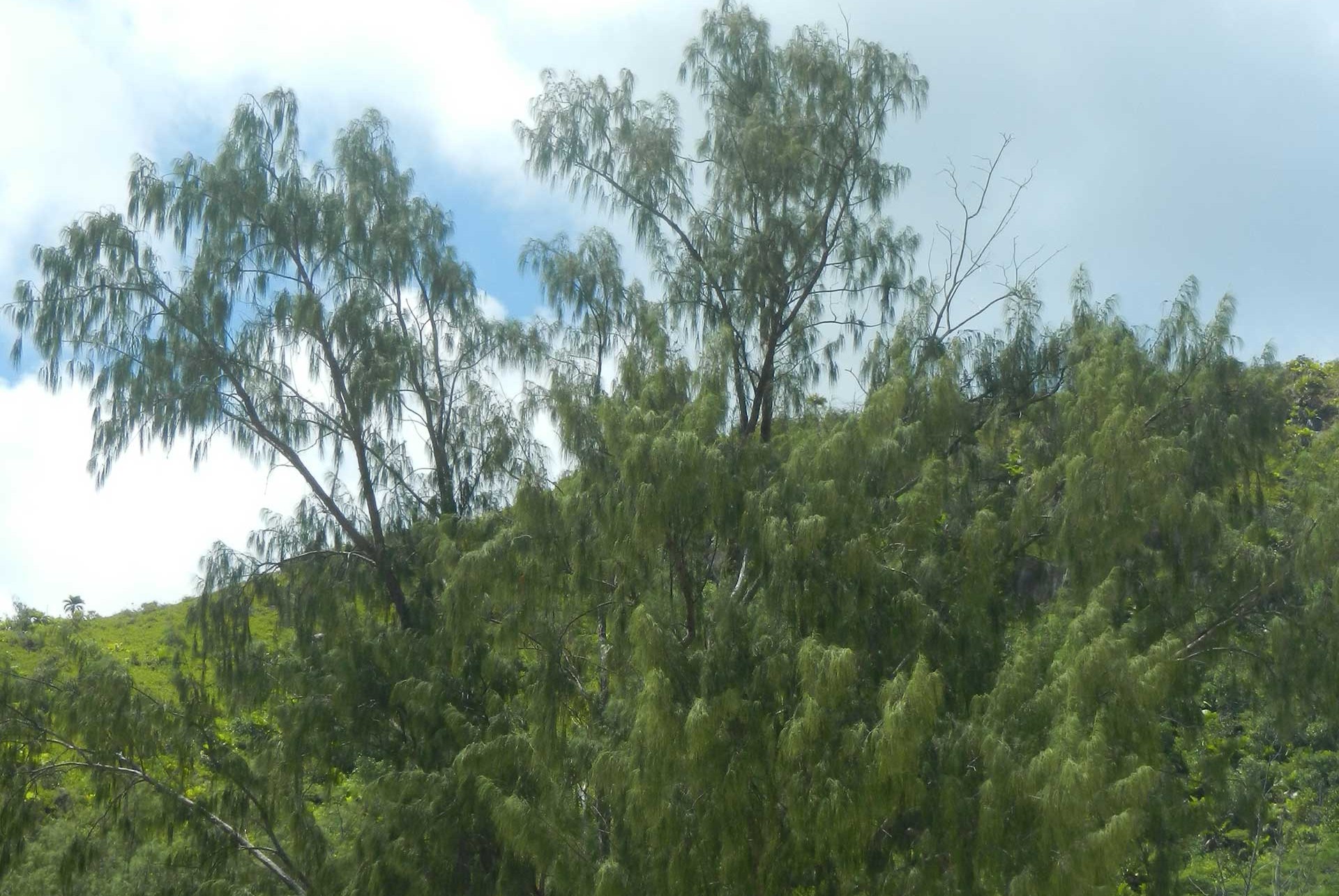 In base a dati recenti, le Seychelles ospitano complessivamente circa 2.000 specie di piante, delle quali solo 426 autoctone, cioè indigene; ciò significa che il 79% della flora totale è rappresentato da piante esotiche (alloctone) introdotte nelle isole per i più svariati motivi economici a partire dalla metà del Settecento, sfuggite al controllo e insediatesi estensivamente nel contesto della vegetazione spontanea. Tra queste, quattro alberi in particolare si impongono al paesaggio: la casuarina (Casuarina equisetifolia, fam. Casuarinaceae Fig. 1) del sud-est asiatico e dell’Australia, di interesse forestale per i litorali sabbiosi; la cannella (Cinnamomum verum, Lauraceae Fig. 2) originaria dello Sri Lanka e diffusa oggi in tutti i tropici quale fonte della spezia; il “Calice du pape” (Tabebuia pallida, fam. Bignoniaceae Fig. 3), ornamentale proveniente dai Caraibi e l’onnipresente palma da cocco (Cocos nucifera, fam. Arecaceae Fig. 4), originaria degli atolli del Pacifico.