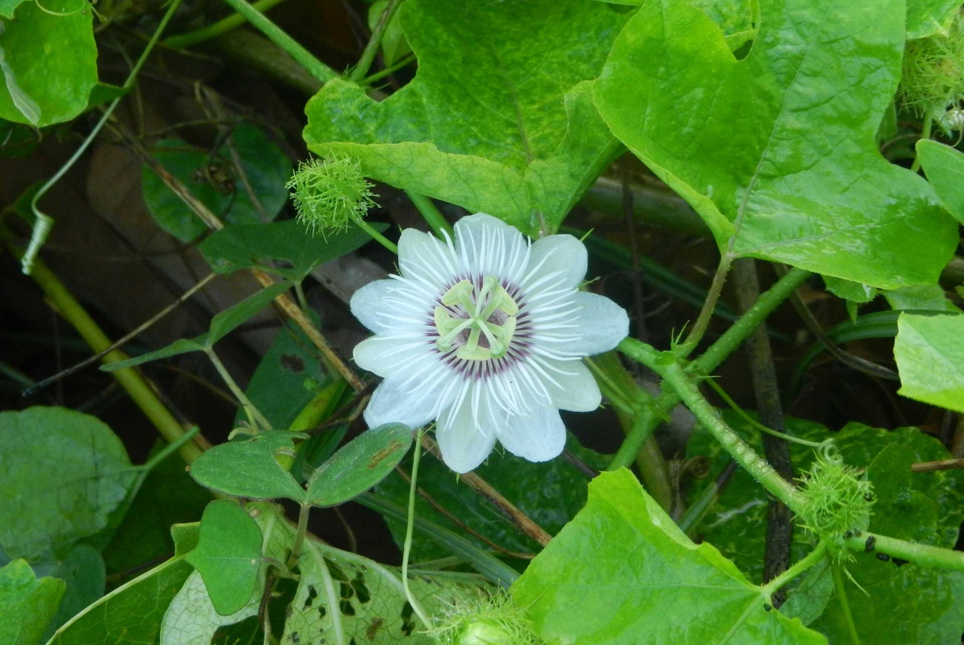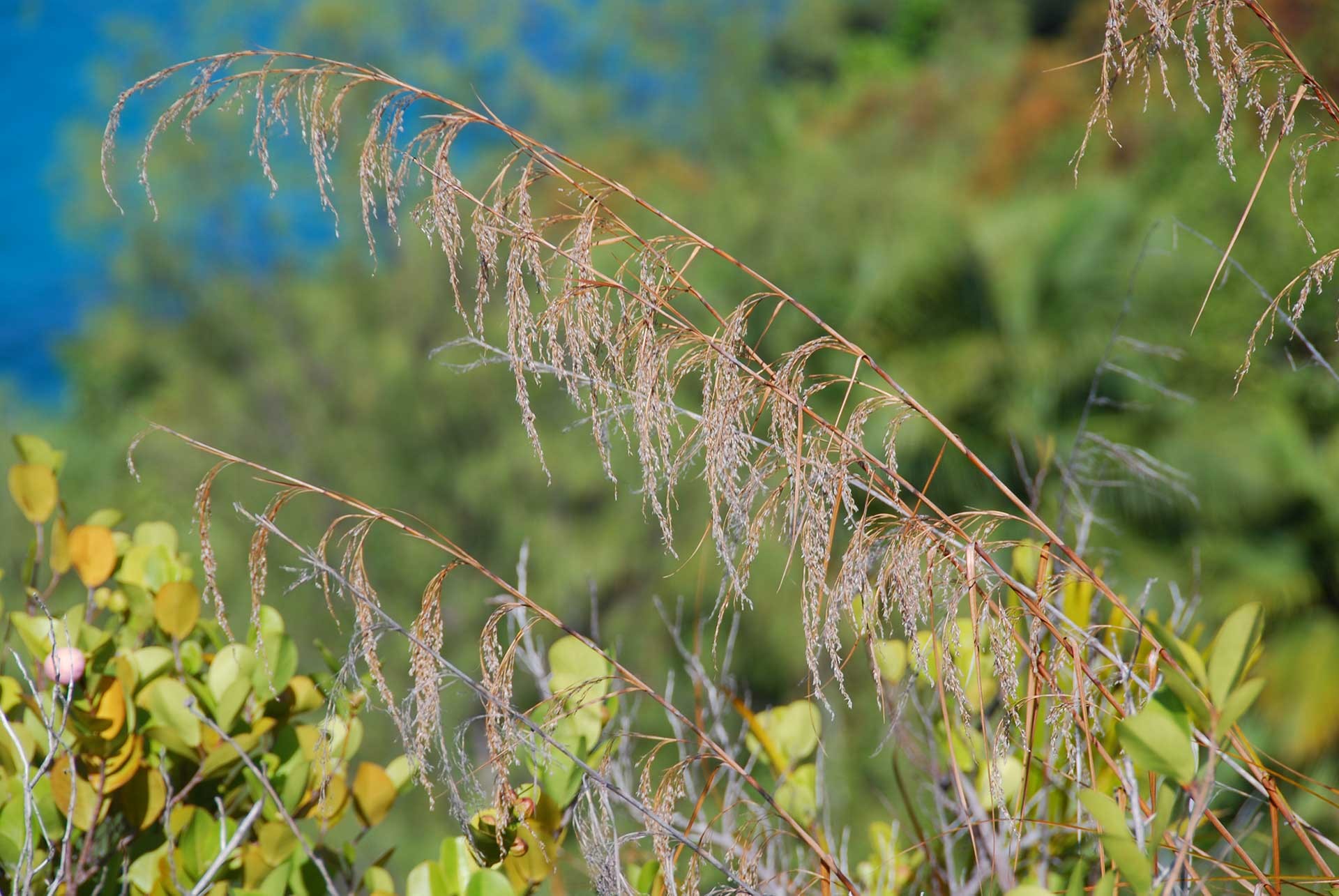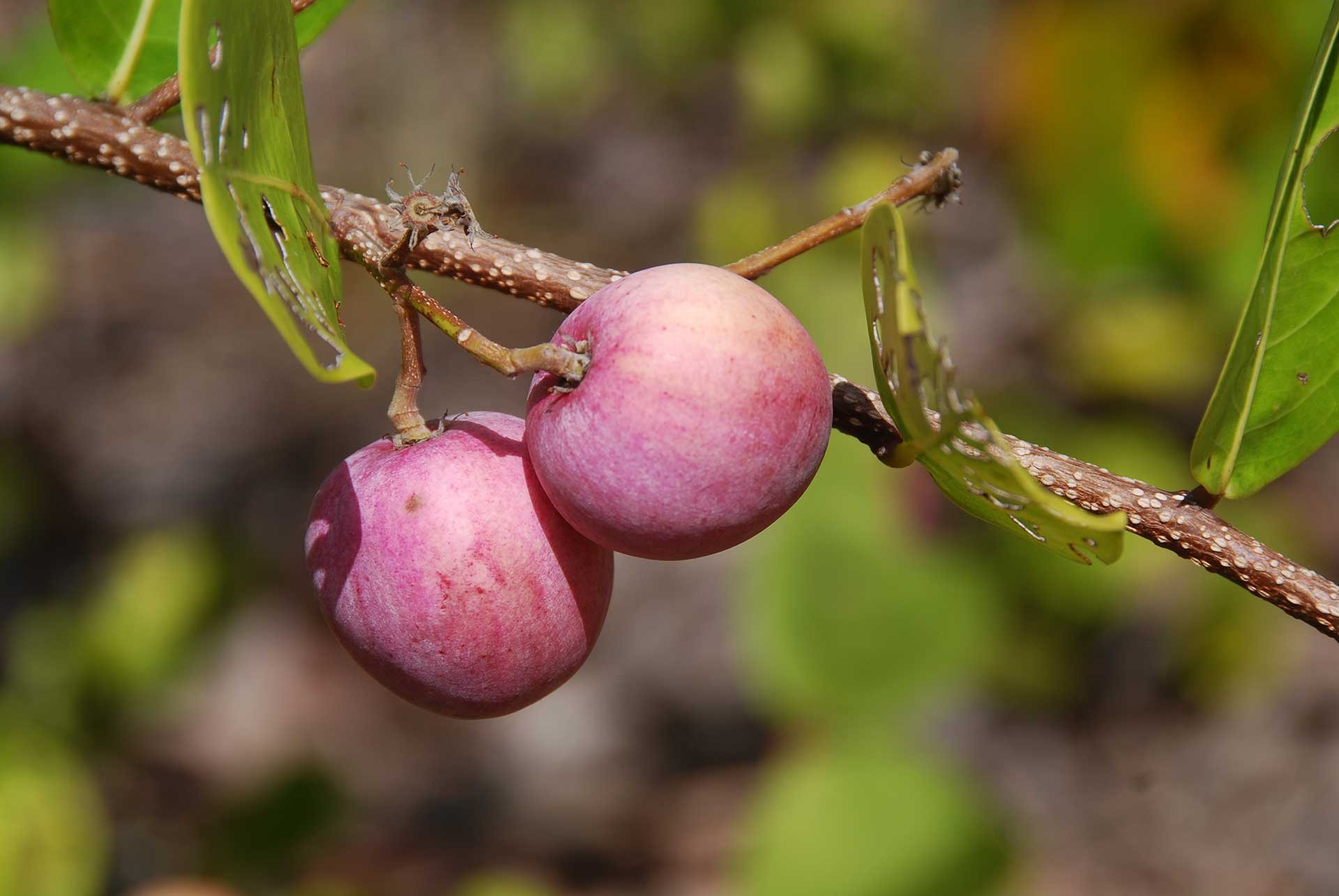 Un arbusto nativo dell’America tropicale, il “Coco plum” (Chrysobalanus icaco, fam. Sapotaceae Fig. 5) ha invaso da tempo ampie superfici collinari disboscate nell’isola di Mahé e fra le erbe esotiche spiccano curiose bellezze ormai intimamente fuse col paesaggio, come la “Jonquille des mers” (Hymenocallis littoralis, fam. Amaryllidaceae Fig. 6) dell’America tropicale e la semicarnivora “Poc-poc” (Passiflora foetida, fam. Passifloraceae Fig. 7), pure neotropica, comune nelle siepi e negli incolti delle isole.