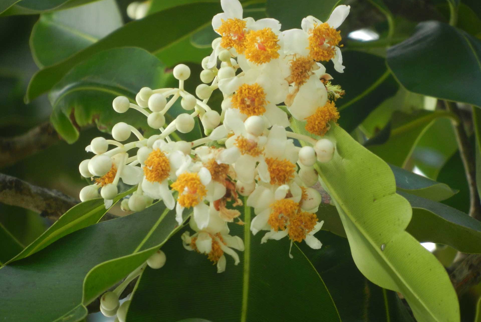 Per quanto riguarda il primo gruppo, lungo le spiagge si incontrano il takamaka o takamahaka (Calophyllum inophyllum, fam. Calophyllaceae Fig. 8), albero simbolo delle Seychelles, il “Badamier” (Terminalia catappa, fam. Combretaceae Fig. 9), il “Bonnet carré” (Barringtonia asiatica, fam. Lecythidaceae Fig. 10), il “Veloutier” o “Bois manioc” (Scaevola taccada, fam. Goodeniaceae Fig. 11), il “Porché” (Cordia subcordata, fam. Cordiaceae Fig. 12), la profumatissima gardenia delle spiagge, in creolo “Bois cassant” (Guettarda speciosa, fam. Rubiaceae Fig. 13), il “Bois blanc” (Hernandia nymphaeifolia, fam. Hernandiaceae Fig. 14), il “Var” (Hibiscus tiliaceus, fam. Malvaceae Fig. 15) e il “Bois de rose” (Thespesia populnea, fam. Malvaceae Fig. 16).