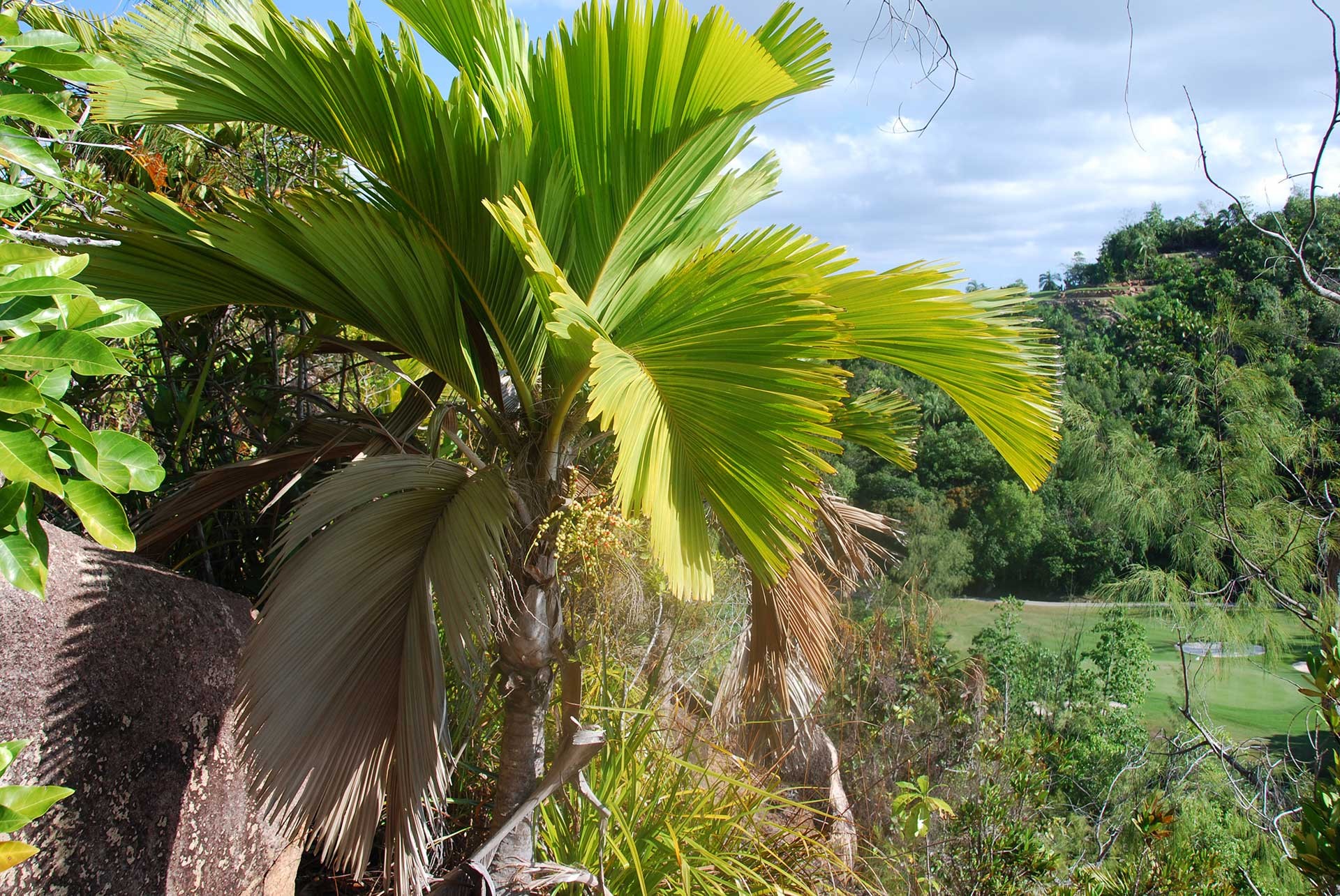 A differenza della comune noce di cocco, navigatrice degli oceani, questo frutto non galleggia nell’acqua di mare, per cui la sua unica destinazione naturale è cadere sotto la pianta madre senza potersene allontanare granché. Ciò spiega come mai la specie si trovi concentrata nell’isola di Praslin, dove forma una vera foresta incantata, fitta, buia e umida alla Vallée de Mai (1.440 esemplari) e a Fond Ferdinand (1.380 esemplari), ma è anche presente nell’isola di Curieuse con 1.750 esemplari. Bello è che a condividere lo stesso habitat ritroviamo le altre cinque palme endemiche, tutte a foglia pennata, le più comuni delle quali in ordine calante di frequenza sono Phoenicophorium borsigianum, Deckenia nobilis e Nephrosperma van-houtteanum; insomma uno scenario da favola nel regno delle palme!