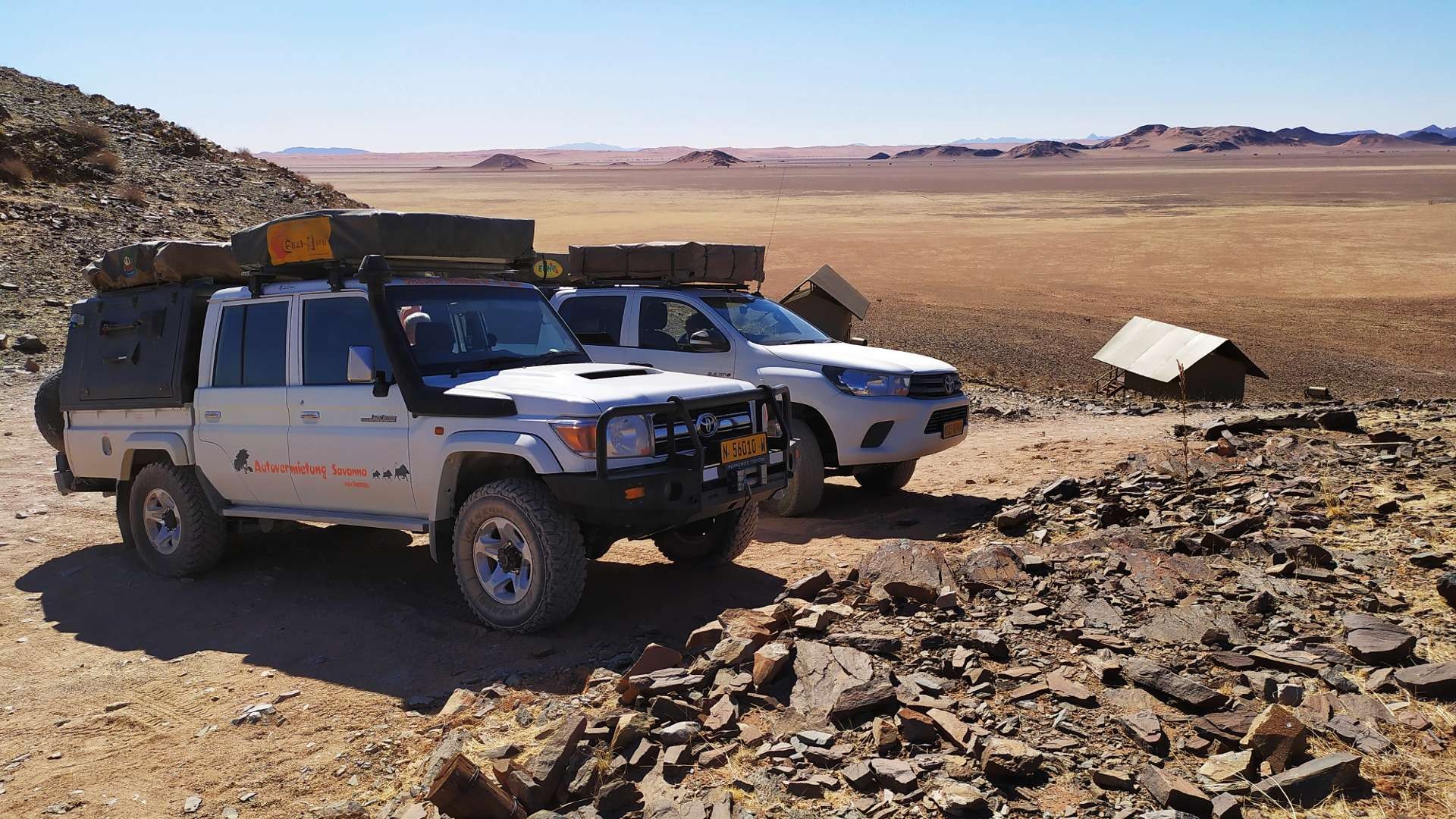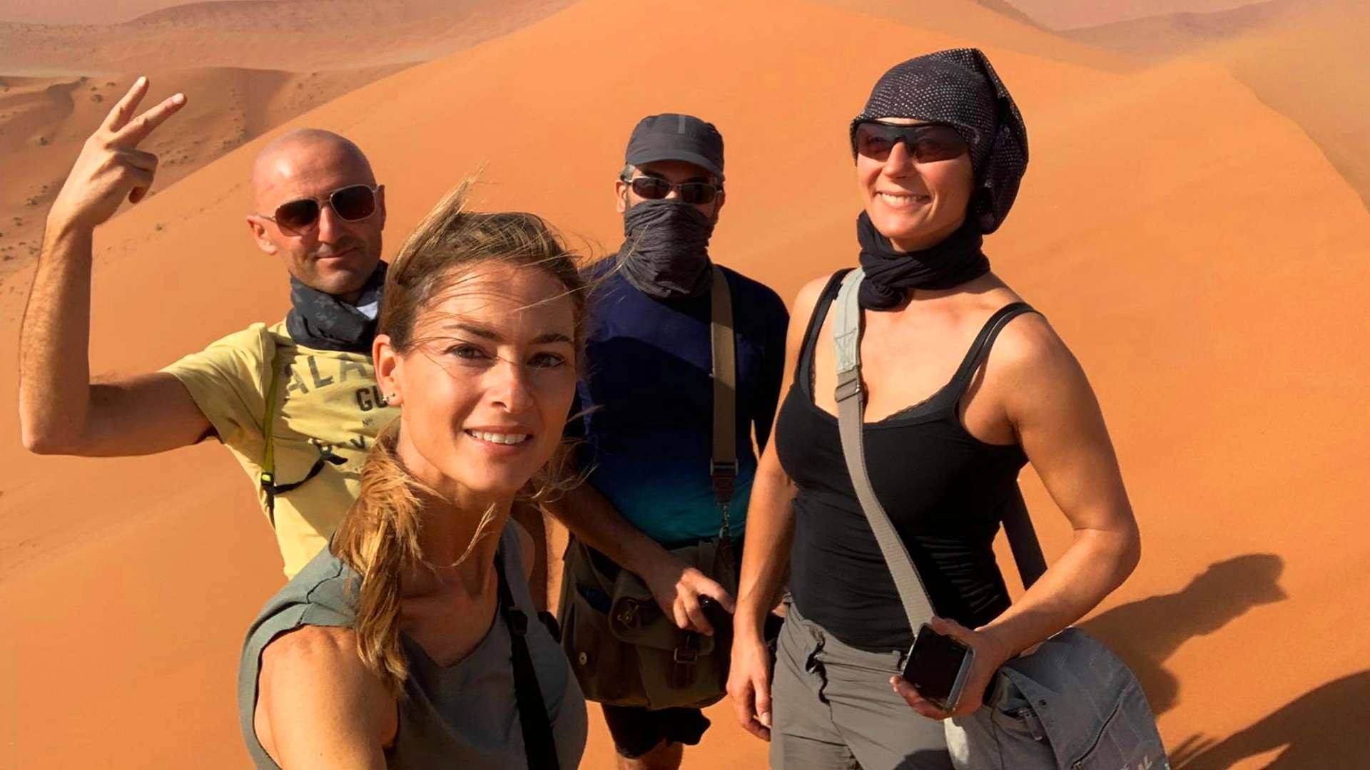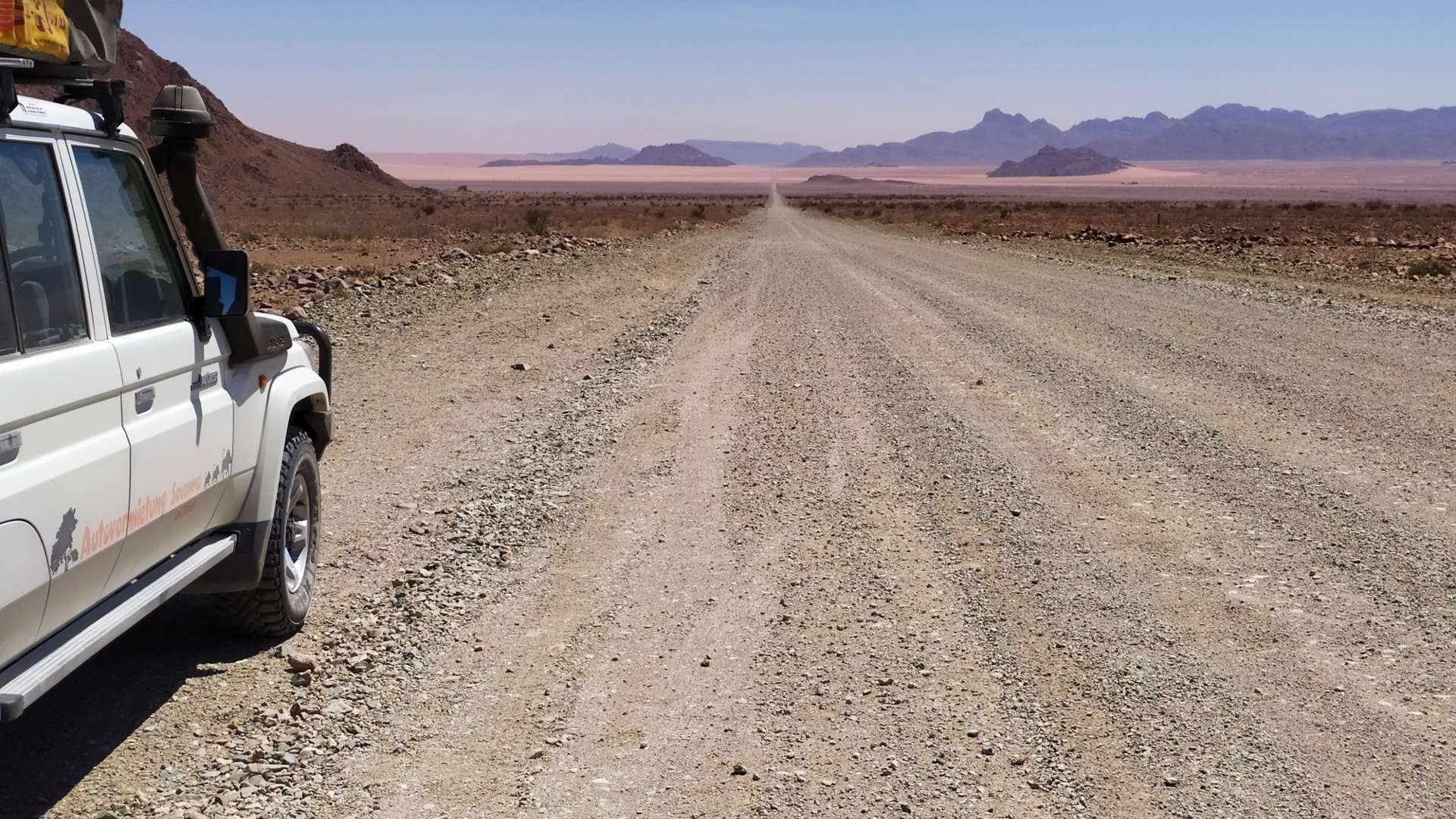 Superando diverse decine di chilometri di una scomoda pista sassosa, raggiungiamo finalmente l'area di Sesriem, non per caso il cuore turistico del paese. Uno splendido affaccio sulle sabbie e le montagne rosse del deserto del Namib ci prepara alle meraviglie di domani. Dopo un'altra foratura, questa volta più “scenografica” e faticosa, raggiungiamo infine il nostro camp, dove pernottiamo godendoci un'altra serata tutti insieme sotto le stelle.