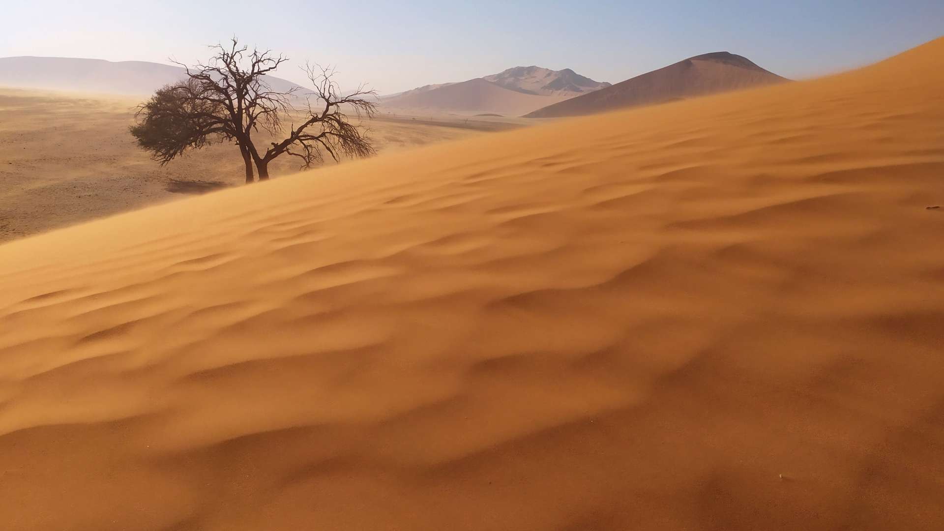 Sesriem Canyon, Sossusvlei, Dead Vlei, Duna 45, Big Daddy, nomi mitici per chi viaggia in quest'area, non a caso la più famosa del paese, la cui visita, il forte vento che imperversa da qualche giorno, mette oggi seriamente a rischio! Sono 60 chilometri dall'ingresso del parco. Arriviamo in zona e c'è una vera e propria tempesta di sabbia. A fatica parte del gruppo riesce a salire sulla Duna 45, da cui godiamo, nonostante tutto, un panorama meraviglioso, che ci è invece del tutto precluso quando cerchiamo di arrivare a Sossusvlei. Qui la visibilità è pari allo zero e rende inutile proseguire. Con la coda tra le gambe, percorsi 60 chilometri di strada a ritroso, ripieghiamo sulla visita del Sesriem Canyon, comunque molto bello, in attesa di un secondo tentativo nel pomeriggio. Si dice che la fortuna aiuta gli audaci e così è anche questa volta. Percorsi di nuovo i 60 chilometri verso il deserto e superati gli ultimi chilometri lungo una divertente pista sabbiosa, finalmente senza vento, riusciamo a raggiungere Sossuvlei ed il meraviglioso Deadvlei. Siamo praticamente soli, in quanto forse in pochi sono stati così testardi da tornare una seconda volta nel pomeriggio come noi, e così ci godiamo in beata solitudine i colori del tramonto sulle splendide dune rosse del deserto del Namib, il più antico del mondo.