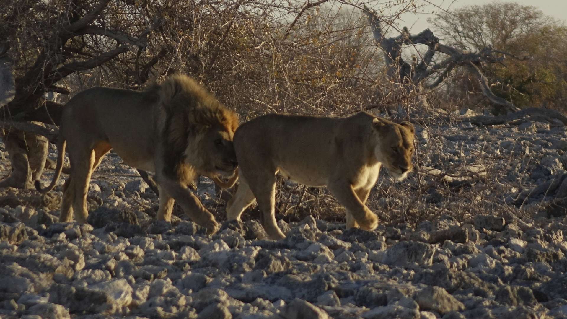 Ci lasciamo definitivamente alle spalle le piste del Damaraland e, dopo aver ripreso l'asfalto, entriamo nell'Etosha, il parco per eccellenza del paese. Il suo nome deriva dalla distesa deserta di fango e sale che caratterizza gran parte della sua superficie. Qui si incontrano la maggior parte degli animali della savana, spesso in numero superiore a quello di gran parte delle altre aree protette africane, inoltre il loro avvistamento risulta molto facile in quanto, vista l'aridità del terreno, gli animali si radunano quasi sempre intorno alle numerose pozze disseminate entro i confini del parco. Altra peculiarità, le pozze create ad hoc accanto alle reti di recinzione dei camp, che permettono anche di notte di avvistare gli animali che qui si vengono ad abbeverare. Leoni che amoreggiano e giocano con i loro piccoli, giraffe che spingono il loro lungo collo quasi all'interno della nostra auto, branchi di zebre che ci circondano, rinoceronti che si abbeverano e leopardi che fuggono sugli alberi per l'arrivo delle leonesse, sono solo alcune delle immagini che riportiamo a casa!