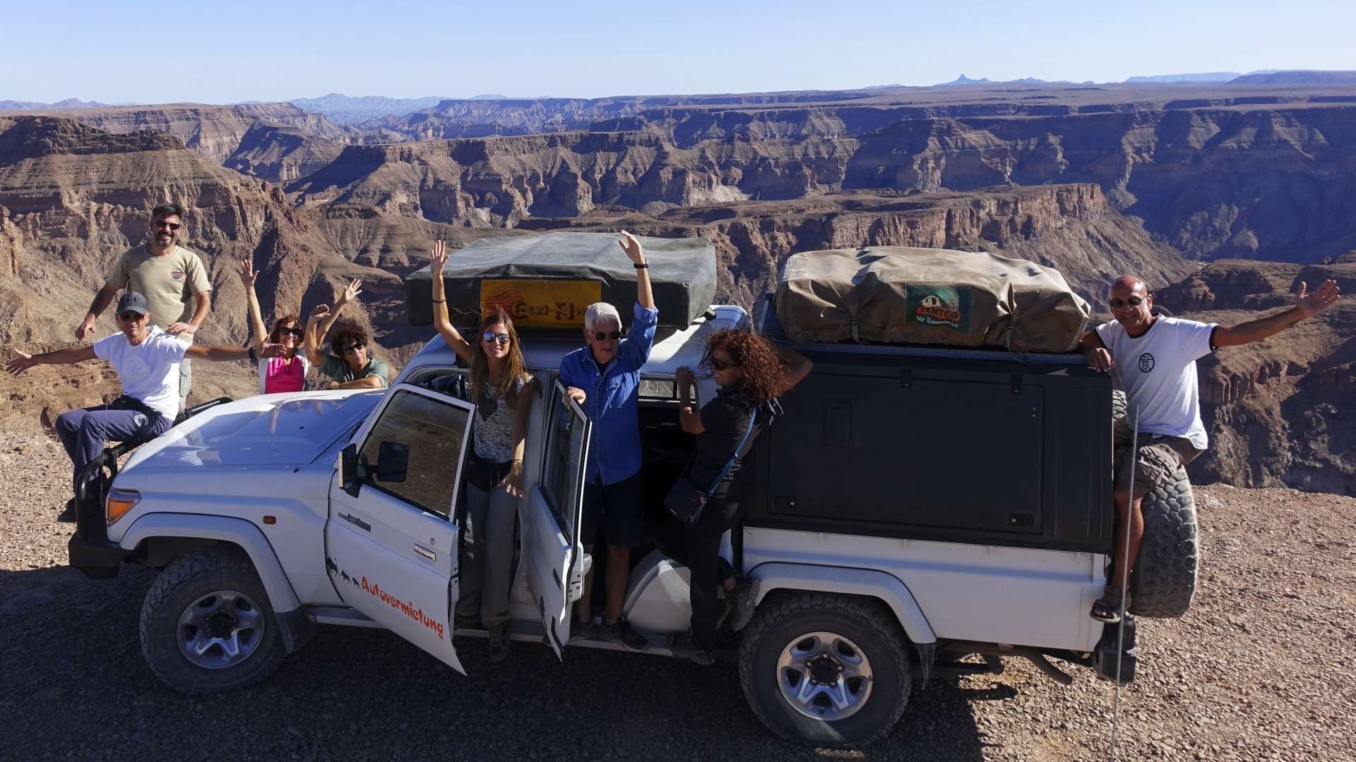 Finalmente insieme, siamo pronti fin dalle prime ore del mattino a goderci una bellissima escursione a piedi nel tipico ambiente desertico del sud del paese. E nel pomeriggio eccolo, è uno dei canyon più imponenti al mondo, quello del Fish River, con i suoi splendidi affacci e la possibilità di ammirarlo dall'alto per una breve parte del suo percorso. E' la nostra prima notte di camping. Superata qualche iniziale titubanza, con le tende aperte sul tetto dei nostri mezzi e il campo ormai montato, è ora di goderci lo splendido cielo stellato namibiano, uno dei più limpidi al mondo visto il bassissimo inquinamento luminoso, non prima però di un abbondante piatto di pasta all’amatriciana cucinato da Rita e Alessandra, le nostre bravissime cuoche volontarie.